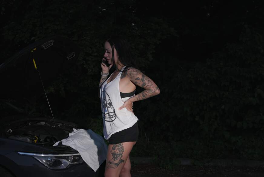 Da stehe ich nun h*****s mitten im Nirgendwo und bin auf dem Weg zu meinem neuen Freund mit meinem Auto liegen geblieben. Gott sei Dank hält ein netter Kerl an und fragt ob er mir helfen kann. Unter meinem S****k Kleid und der Lederjacke kann man deutlich meine hautfarbenen Nylons und schwarze S***pse sehen. Als ich mich bücke und mein aufgestrapster A***h freigelegt wird, hat er plötzlich eine fette Beule in der Hose. Bei diesem Anblick kann auch ich nur noch an gut geschmierte K****n und Zylinder denken, packe das R**r aus und b**se ihm geil einen. Ich ziehe mich aus, präsentiere ihm meinen sexy S***ps Body, strecke ihm meinen prallen Bubble B**t entgegen und zeige ihm meine geilen F**kl****r. Als ich ihn anbettel dass er mich bitte f...