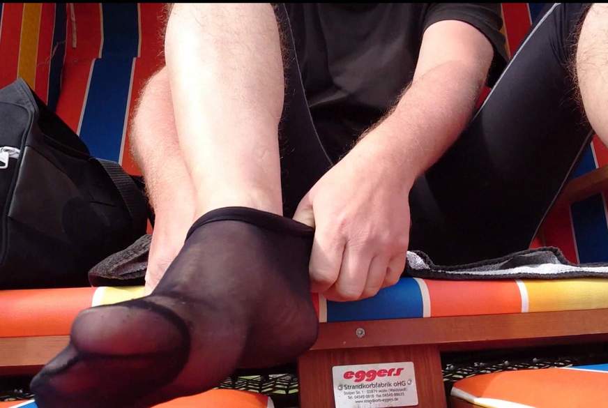 Ich genieße den Tag im Strandkorb in meinem Urlaub. Die Sonne scheint - doch kommen öfters ein paar kleine Wolken. Kalte Füße sind nichts für mich - da ich ihn Ruhe lesen möchte. Also ziehe ich meine Feinstrümpfe an und mache es mir so wieder im Korb bequem. Leute die vorbeigehen - können so meine Zehen und Füsse in Nylon sehen. Kniestrümpfe sind irgendwie komisch aber doch an den Sohlen sehr Sexy anzusehen.