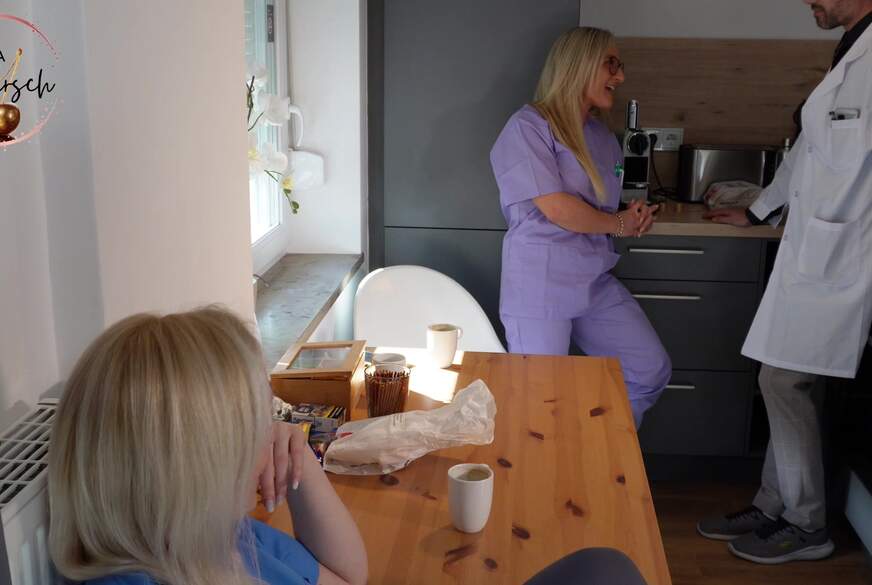 Mitten in der Kaffeepause stört mich und meine heiße Kollegin doch dreist der neue Arzt beim Lästern. Und hat dann auch noch keine Kompetenz, sich selber einen Kaffee zu machen. Na hoffentlich kann der geile Arzt mit anderen Q**litäten glänzen… Also haben wir ihn einem gründlichen ausführlichen Check unterzogen! Ich sags euch, so eine Kaffeepause hatte ich noch NIE! Wozu so ein Krankenschwesternzimmer doch alles gut ist! #krankens*******r #nurse